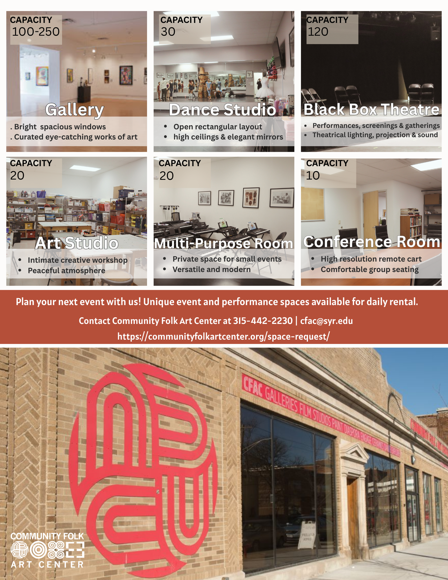 Community Folk Art Center offers rental of their space to students and community. Spaces include The Community Black Box Theatre, The Herbert T. Williams Gallery, Multi Purpose Room, Dance Studio and Conference room.